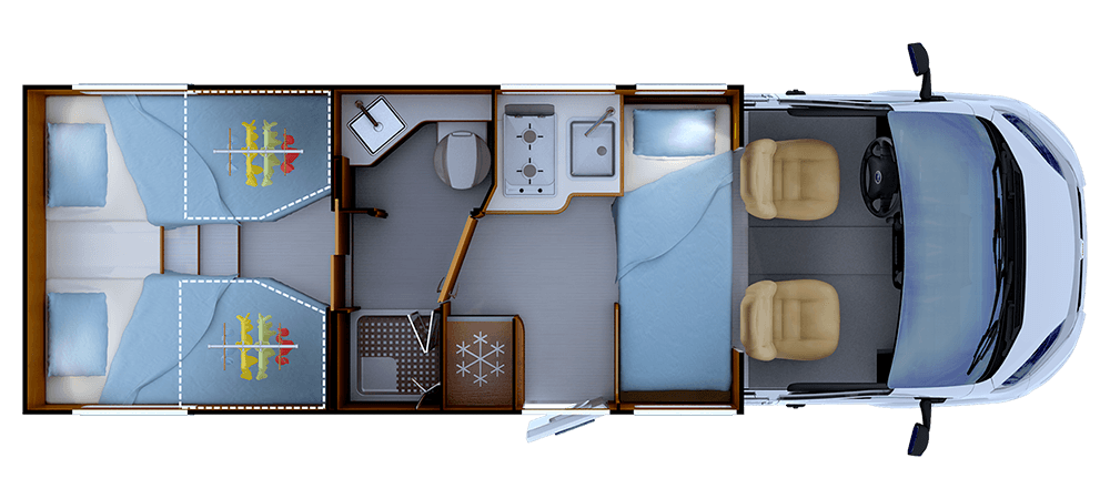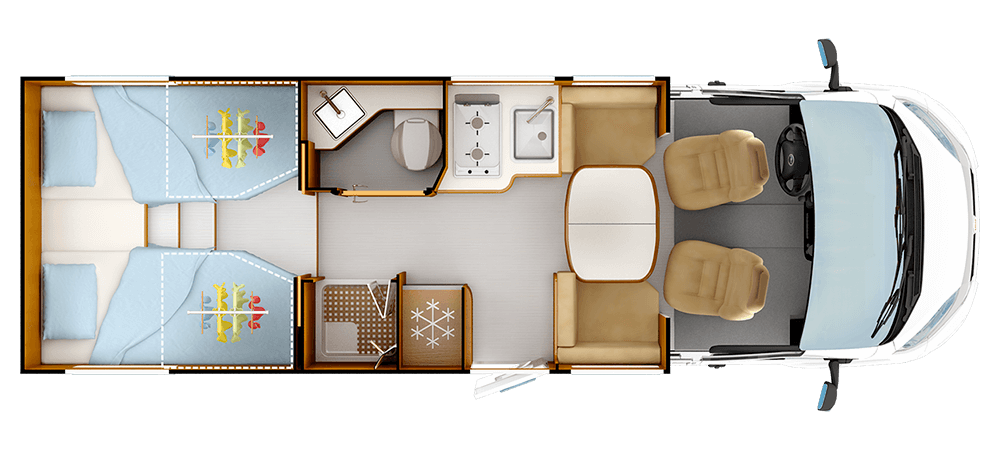 Den enda kompakta halvintegrerade med dubbla enkelsängar, soffa för att sitta mitt emot varandra och separat dusch