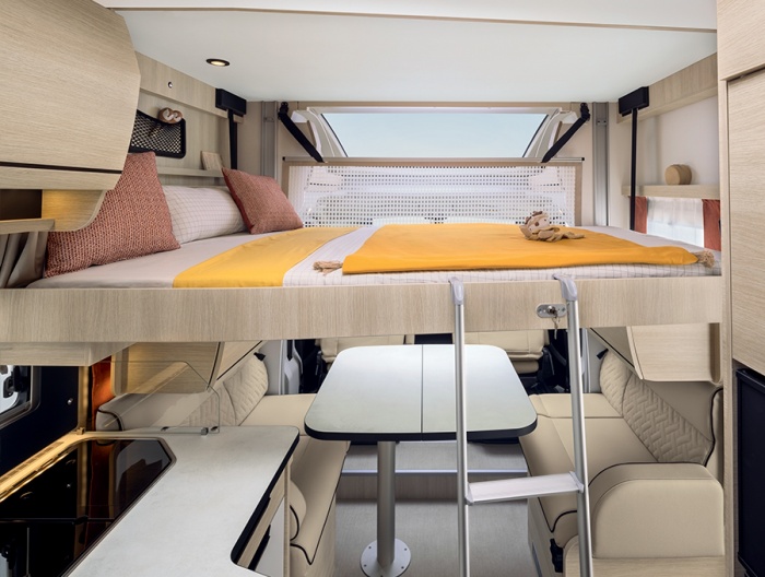 Sugen på att utforma din 6F-serie så som du vill ha den? Elektriskt justerbar dubbelbädd som tillval till alla modeller. Den finns som standard på 606F-modellen. På så vis får du 4 bäddplatser i ditt fordon.