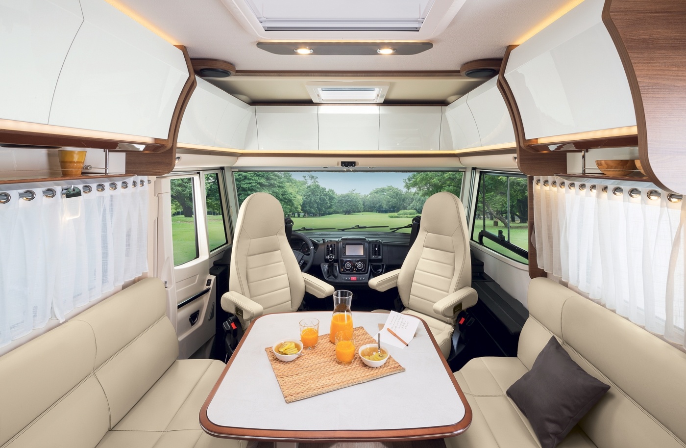 UTAN SÄNG I FÖRARHYTTENMed teleskopiskt bordsben på bordet för sängläge i sällskapsrummet.