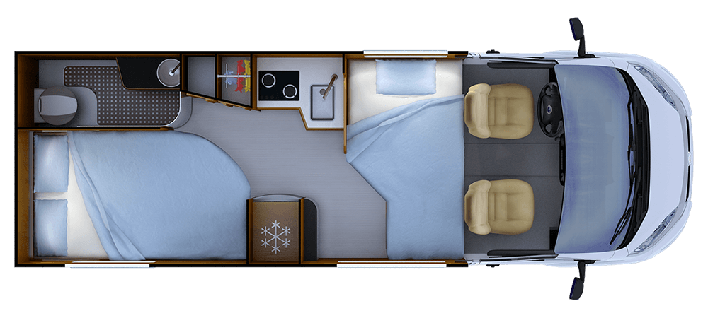 • Utrymme med lådor för bestick och kastrullförvaring, invändig PVC-beklädnad för hög hållfasthet, elektriskt centrallås och larm vid motorstart om man glömt att låsa